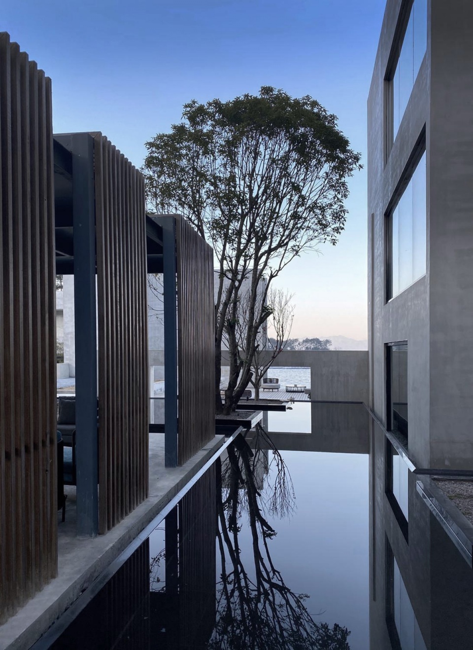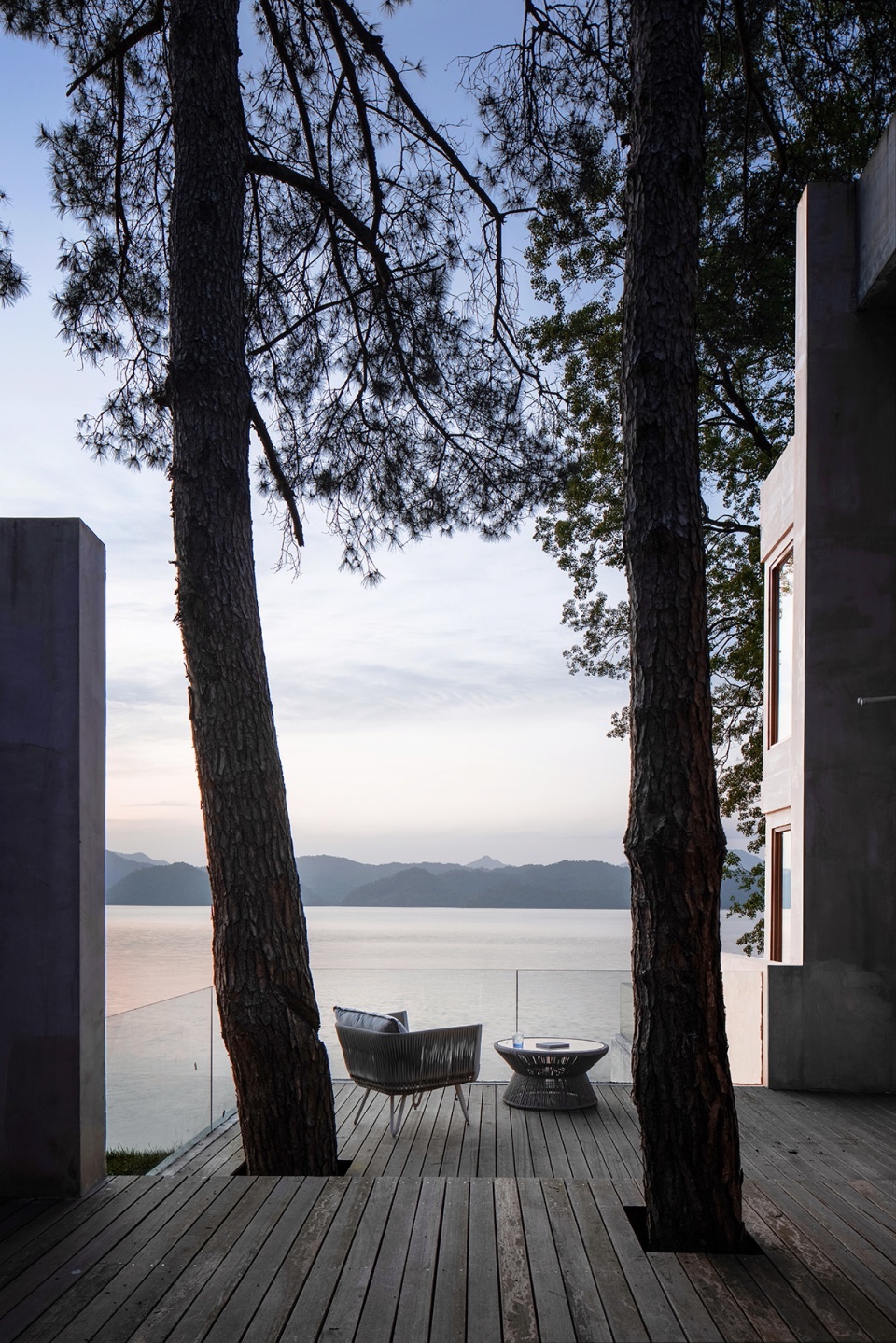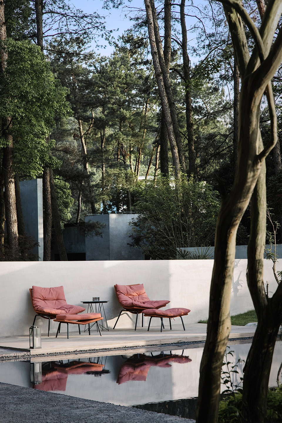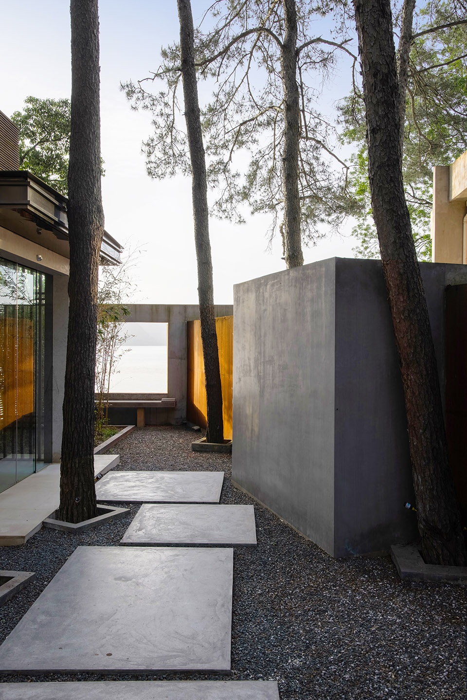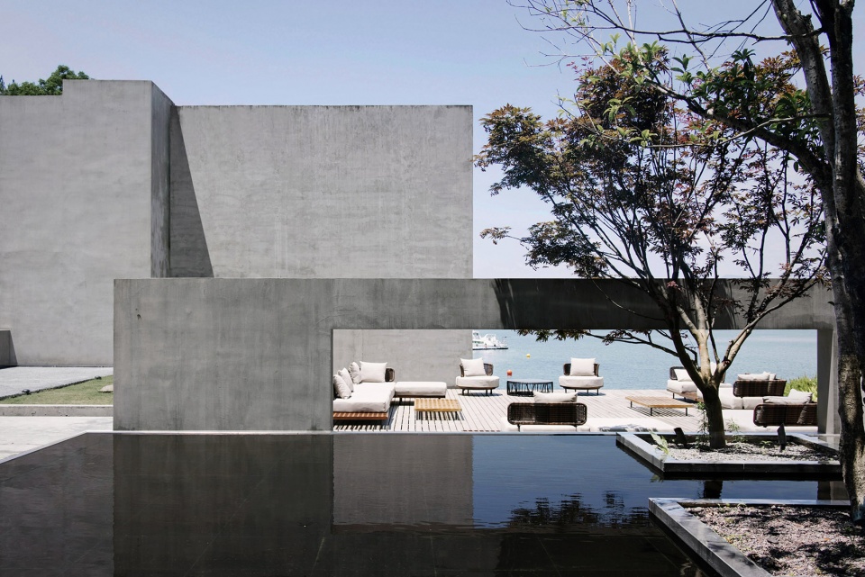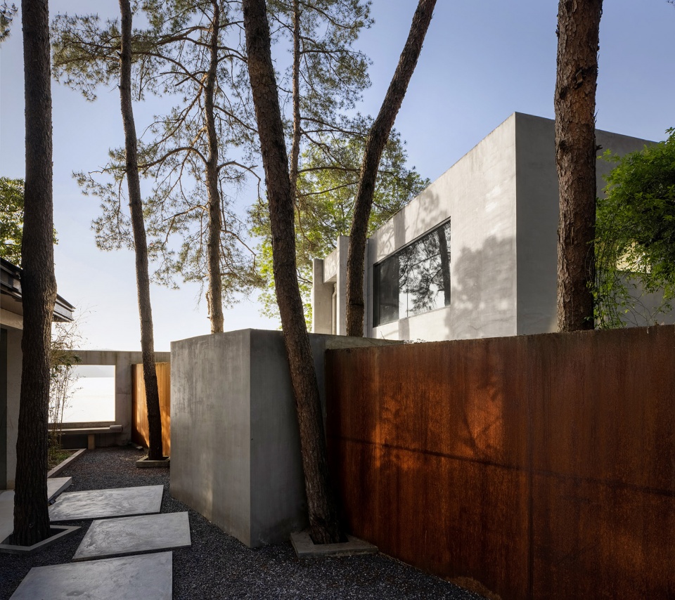 世阿弥说“越隐秘越迷人”,主体的隐匿和不甚完美,却是观者想象力之来源。于是极少主义建筑观望着湖面,粗粝质朴的混凝土、老树和光影交织。