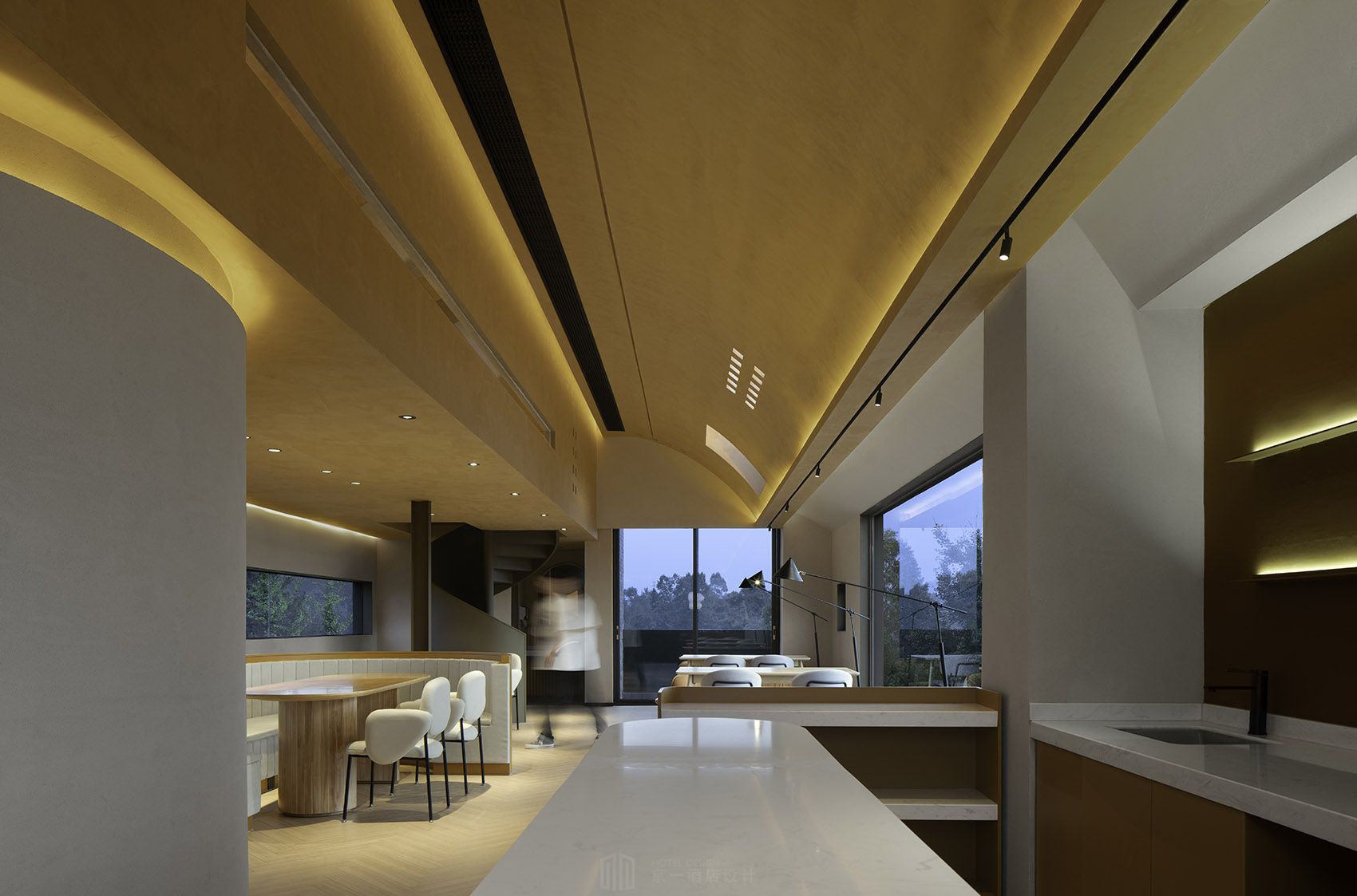 原建筑场地高低错落,形成了自然且富有韵律的建筑天际线。设计最大化的保留了原场地的错落感。将建筑结构做具有上下高差的多层次动线设计;为丰富主景观视野,利用坡道,楼梯等,形成多条循环动线。