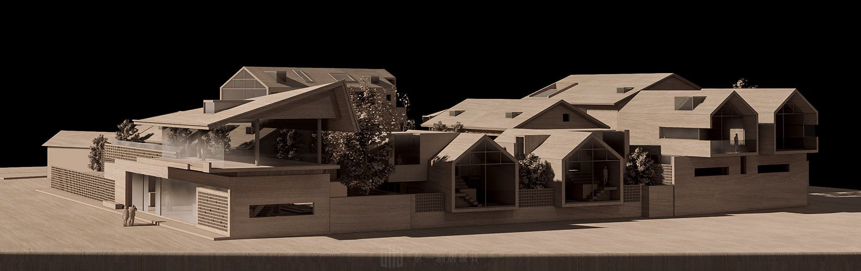 项目二期9栋建筑拔地而起。勿忘在莒,为保持当地民居的建筑韵味。综合场地现况,为减少基地大量开挖对周边土层环境的影响,故保留了原地形的高差,将四栋老建筑改造翻新,新建五栋单体建筑。其中四栋改造的建筑,把原始墙体及木结构进行了修复和结构加强。在宁静的基地与环境中重新构筑一栋庭院相间、内外相连的复合建筑群。