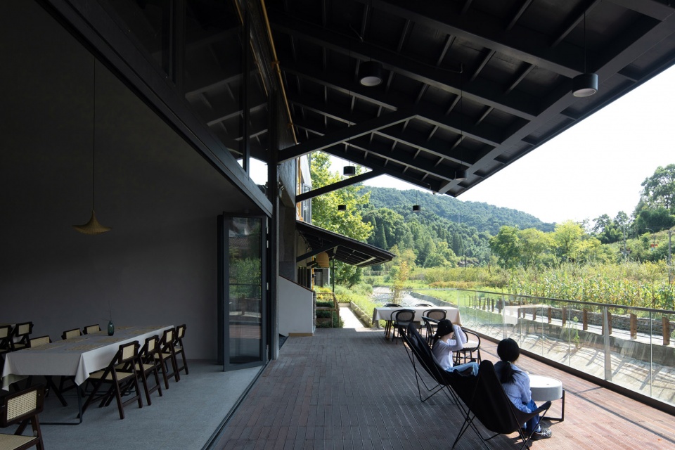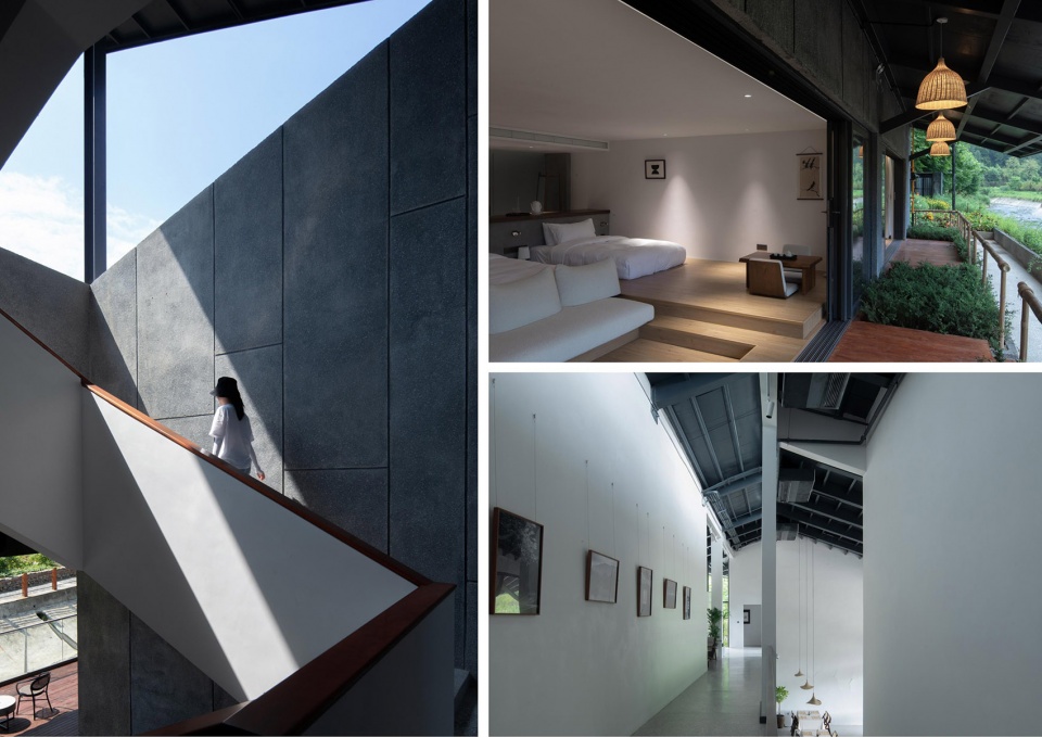 穿过酒店大堂区,右手边的楼梯通向的是酒店餐厅,餐厅延续了原来亲子体验区的空间设计,只是扩大了原有厨房区,保证了民宿完整的用餐服务需求。而原来的入口展厅区、包装区、豆腐生产空间、茶室和晾晒平台则被改造成10间客房区。除了原展厅区域的外廊因改造而变成客房的私有阳台之外,其余河畔的外廊空间均得到了保留。