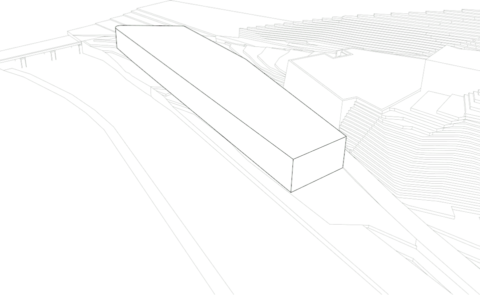 最开始整个建筑的屋顶,考虑的是顺应场地高差的地势形成一个干净纯粹的单坡屋面,远远的看着它静静的躺在溪边,从屋面上天井里探出几棵高耸的大树,让整个建筑的形象更加强烈的映入大家的第一眼印象。但是考虑到沿溪边低地一侧展示开放空间的高度需求,和西南地区降雨的排水对屋顶坡度的要求,单坡屋顶会造成处于高地位置的生产空间沿道路侧的临街尺度过于高耸巨大,而且路的另一侧紧邻一处高7、8米的挡墙,这种压迫感会更加强烈。