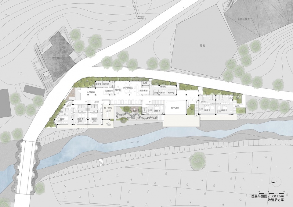 在确定要进行改造后,甲方最初提出要有12间客房,根据对原有空间的一次快速梳理,如果要做到12间客房,整个民宿设计基本上没有公共空间可以使用了,所以我们提出了最多10间酒店客房的修改意见,保证足够好的公共空间是提升民宿品质非常重要的因素。最终的布局,所有客房区域和酒店餐厅安排在原有临近溪边靠近自然的空间,可充分的体验乡野林下,溪水潺潺的的自然生态美景,品尝乡间美食。整个公区后勤空间沿用原来的生产空间,靠近高地道路边,隔绝道路的繁杂,保证客房的安静,也方便后勤管理。