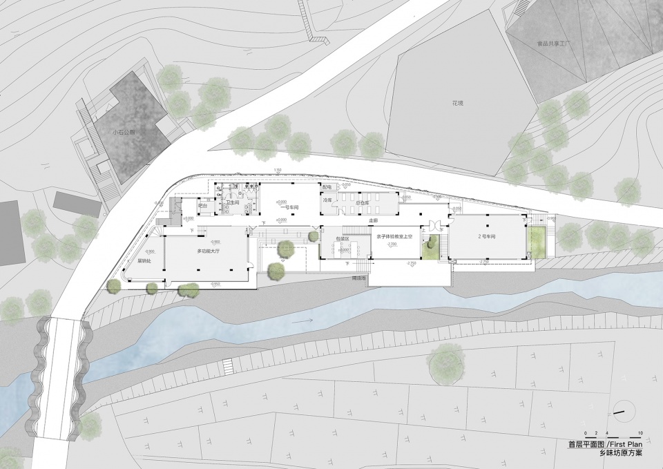 另一个是豆腐和粉类加工生产区,因有很多用水的需求,为了方便后期的维护,就放置在生产流线的末端。而作为配套需求的物料储藏空间和包装空间则放置在两个生产区之间,处在临溪一侧的休闲空间流线上,这里也可以结合亲子体验空间的需求,作为扩展空间来使用。
