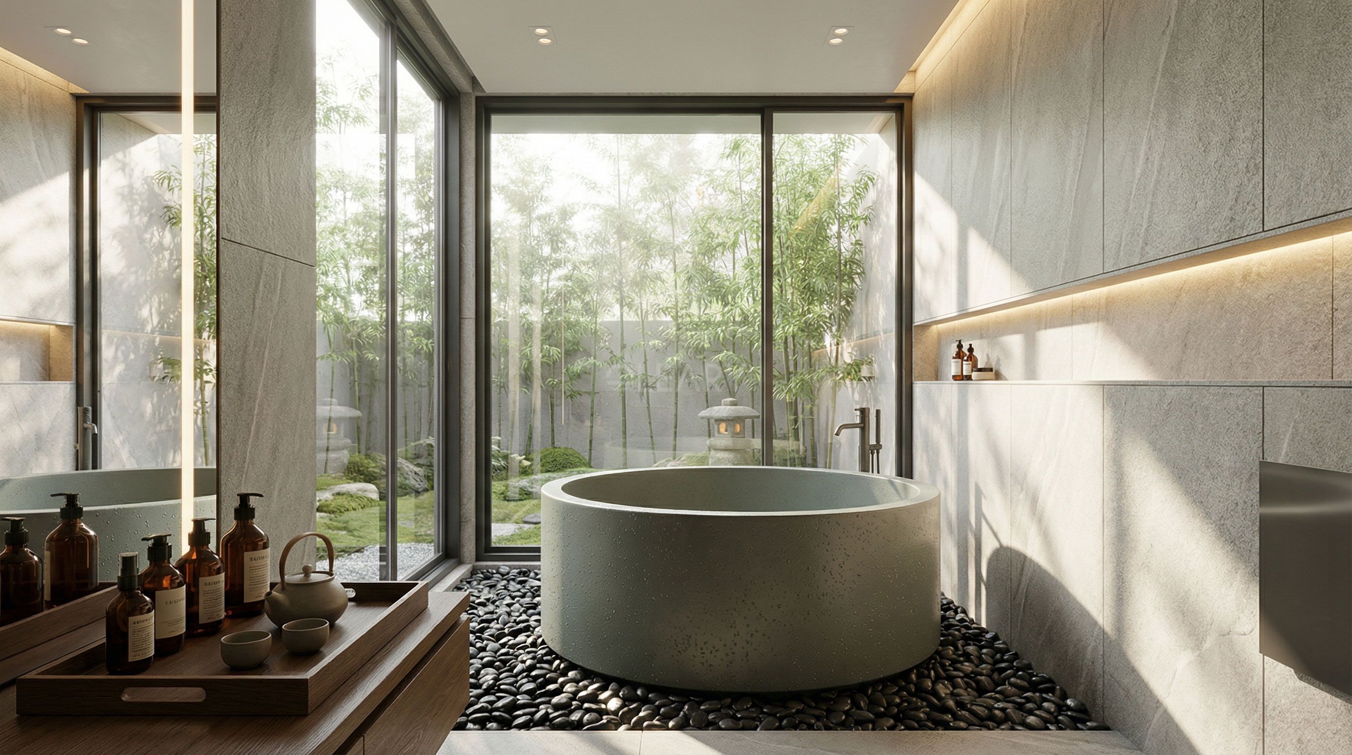 这张照片展示了一个典型的禅意风格浴室。圆形的哑光白浴缸安静地置于空间中央,下方铺着黑色鹅卵石,落地窗外是日式庭院景观。竹子、石灯笼、砾石,每个元素都透着东方美学的韵味。这种设计在高端度假酒店和精品民宿中越来越受欢迎。