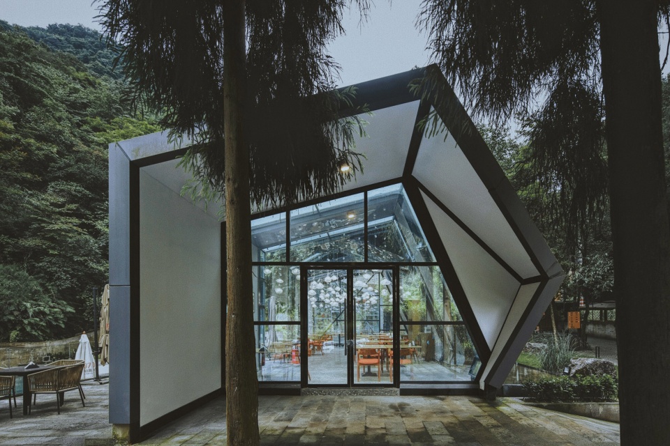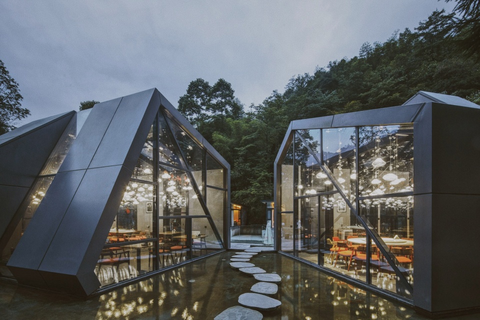 在餐厅材料的选择上,设计师大量使用了明快通透的玻璃和富有质感的金属铝板,大面积的落地窗与天窗的应用将四周的山峦之景引入室内,形成“空间的景框”,从而保证了客人在品味当地特色美食的同时,也能享受视觉的“盛宴”。