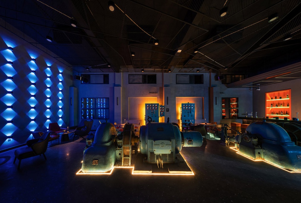酒吧是由旧发电车间改造而成,兼顾了咖啡、棋牌室等多重功能。同时该空间也是酒店的“博物馆”,陈列展示着旧厂址的遗存机器,身处其中,访客可以近身感受那段鲜为人知中国“三线建设”历史,了解它的变迁历程。