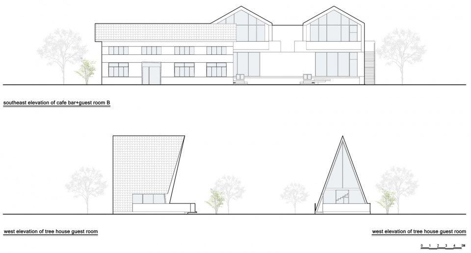 Loft山景客房是由原工厂的餐厅空间改造设计,建筑外立面设置了大面积的玻璃幕墙,与临近的客房区形成疏密与虚实的双重对比。推窗而出,便是宽大的露台,无论是在室内还是室内外,环绕的山峦美景如影随行,让人忘却了空间的局限与限制。树屋客房与自然山景巧妙融合,营造出归隐乡野,平静安宁的氛围。