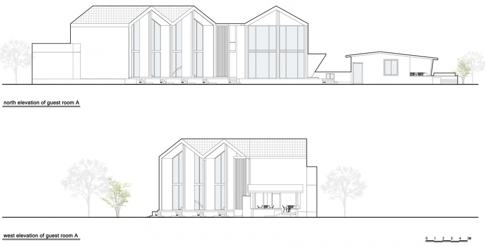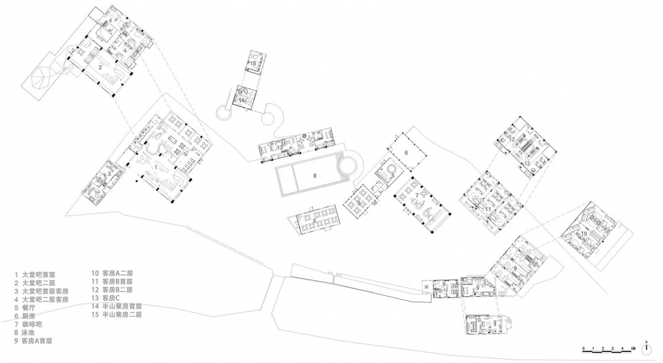 酒店客房以泳池为中心,分布于不同方向,并根据不同的自然景观和设计特色具体分为:半山别墅、loft亲子套房、山景套房、园景套房、历史套房、泳池大床房等不同房型。考虑到大邑地区常年雨水较多,大部分客房建筑主体均采用了坡屋顶结构,这样的设计除了满足功能的实用性外,也能与连绵起伏的山丘形成呼应,真正融于自然之中。