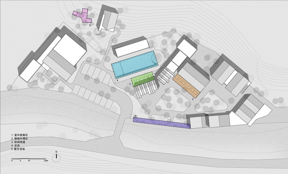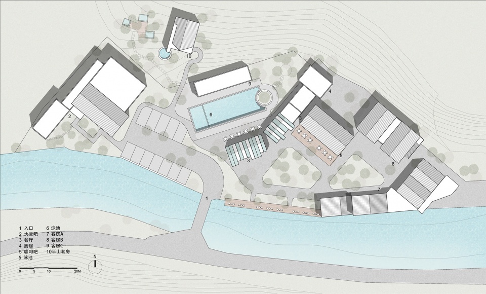 酒店布局主要分成三个主体区域,分别为特色大堂吧及工厂loft区、客房区和功能配套区。除了绝佳的自然环境之外,为了让居住在此的游客们彻底地得到身心的放松和娱乐。我们在酒店的多功能配套区特别营造了四种不同的社交场所,分别为餐厅区、休闲栈道区、景观泳池区和酒吧区。