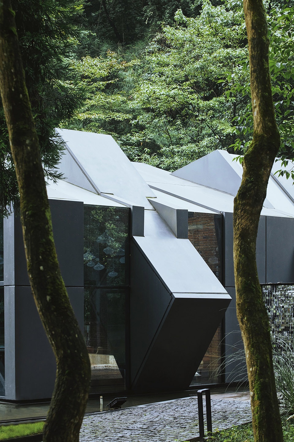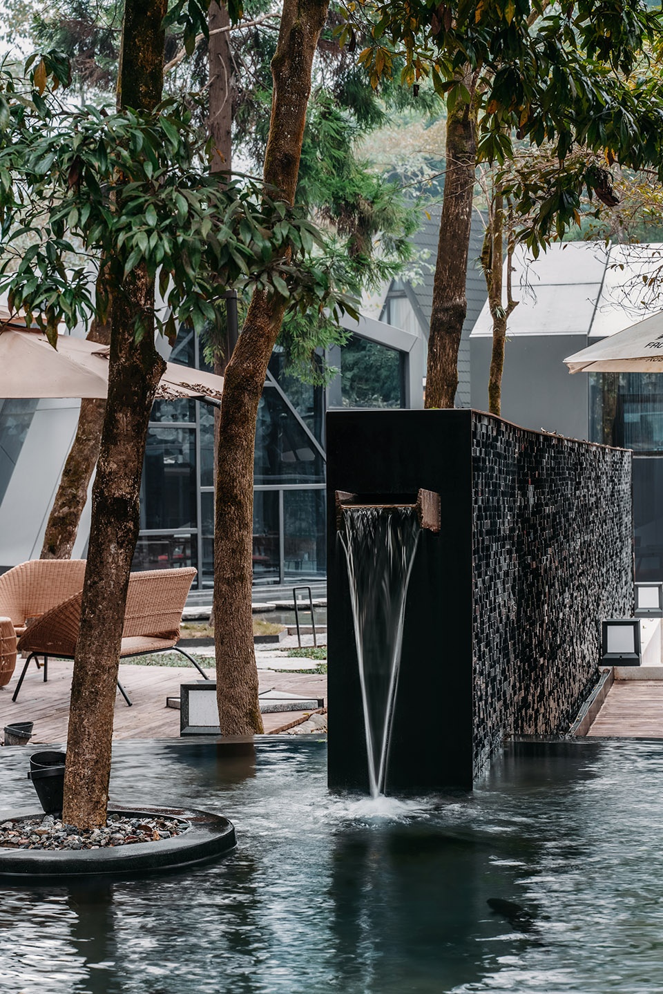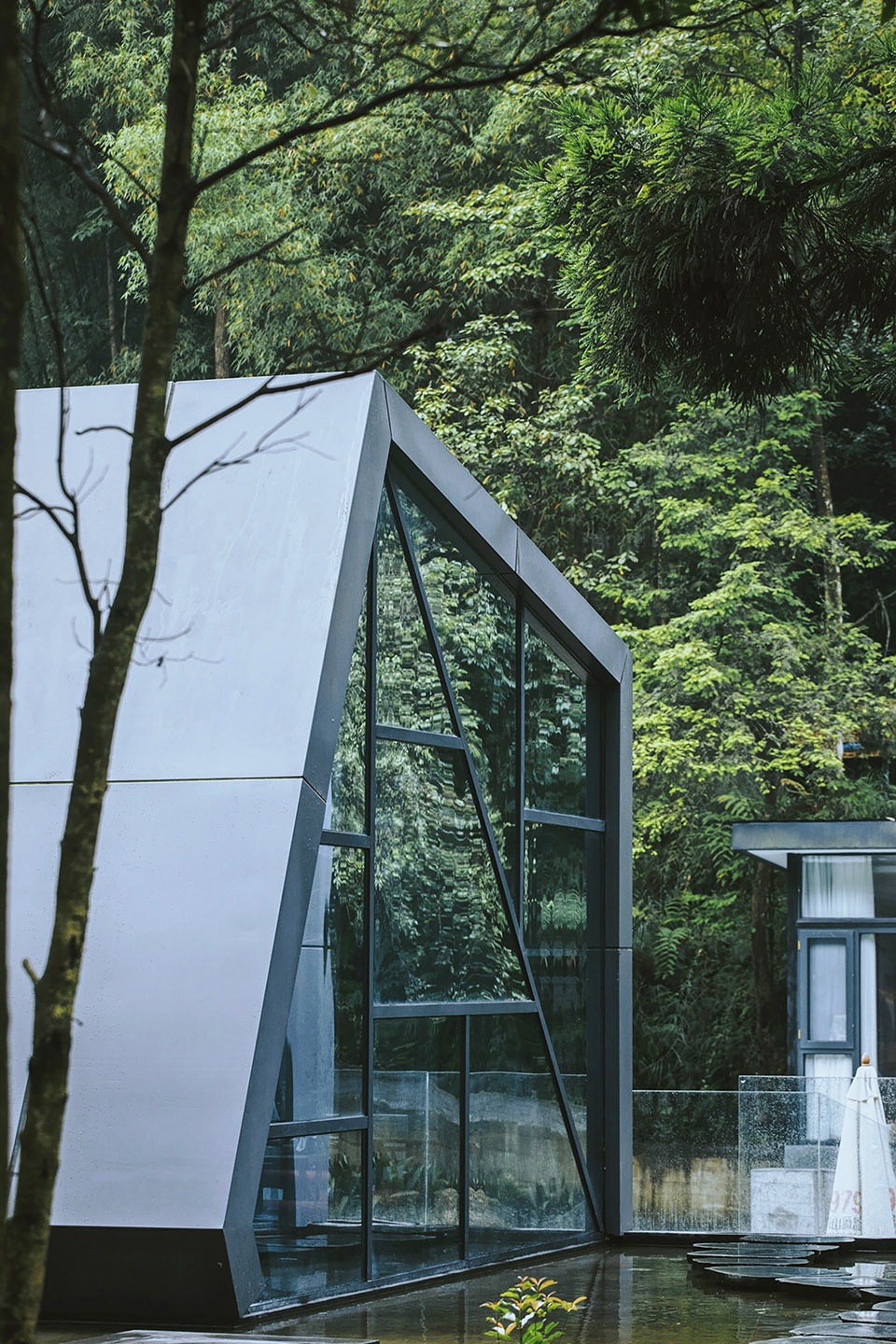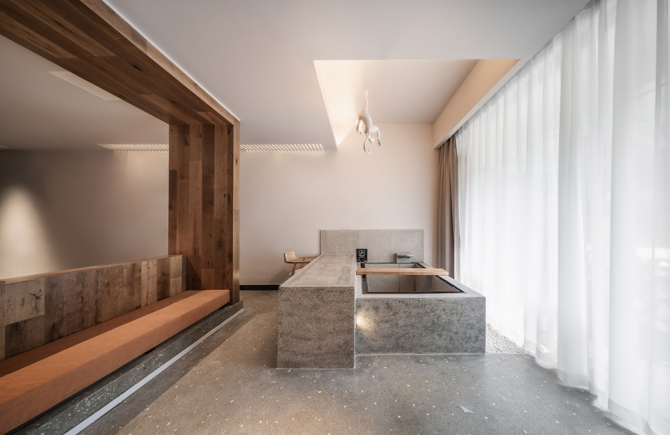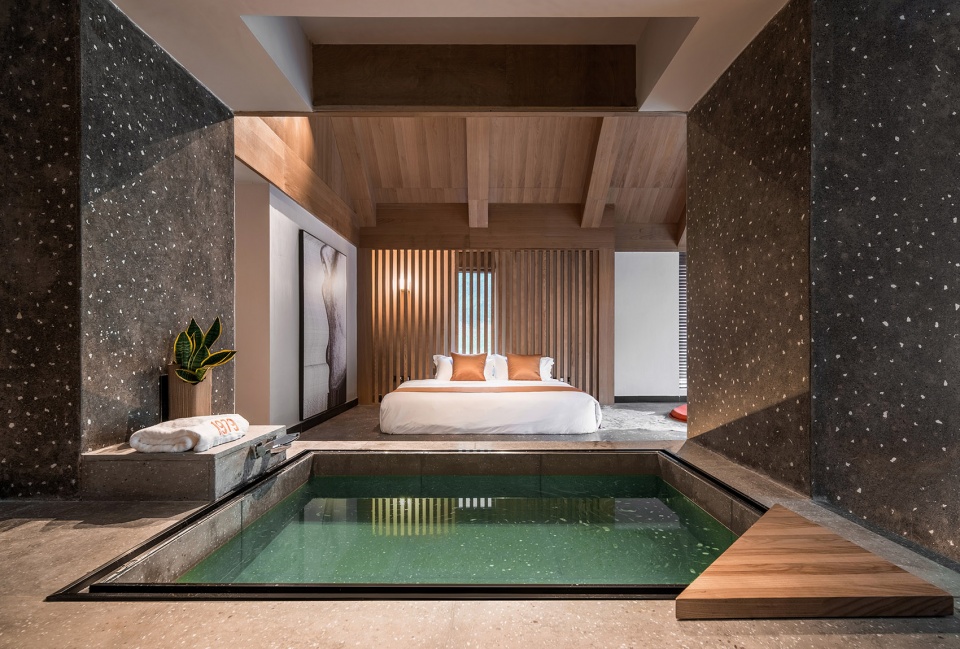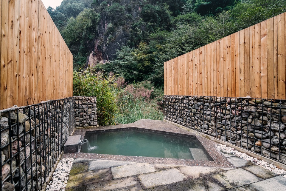 位于山谷深处的泳池是酒店的核心景观,由旧排放池改造而成。设计除了考虑它的功能性和安全性外,还特意营造出建筑像盒子一样浮在水面上的错觉,人们在泳池中可以观赏周边郁郁葱葱的植物和山峦,感受有别于都市酒店的度假体验。